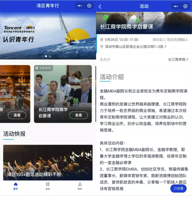 5月5日,大湾区名企名校青年研学体验平台——腾讯“青年行”上线,正式面向粤港澳三地中学生开放。5月下旬,湾区青年学生将可以在微信小程序内报名参加课程。预计未来三年,这个平台将服务超过一万名湾区中学生。