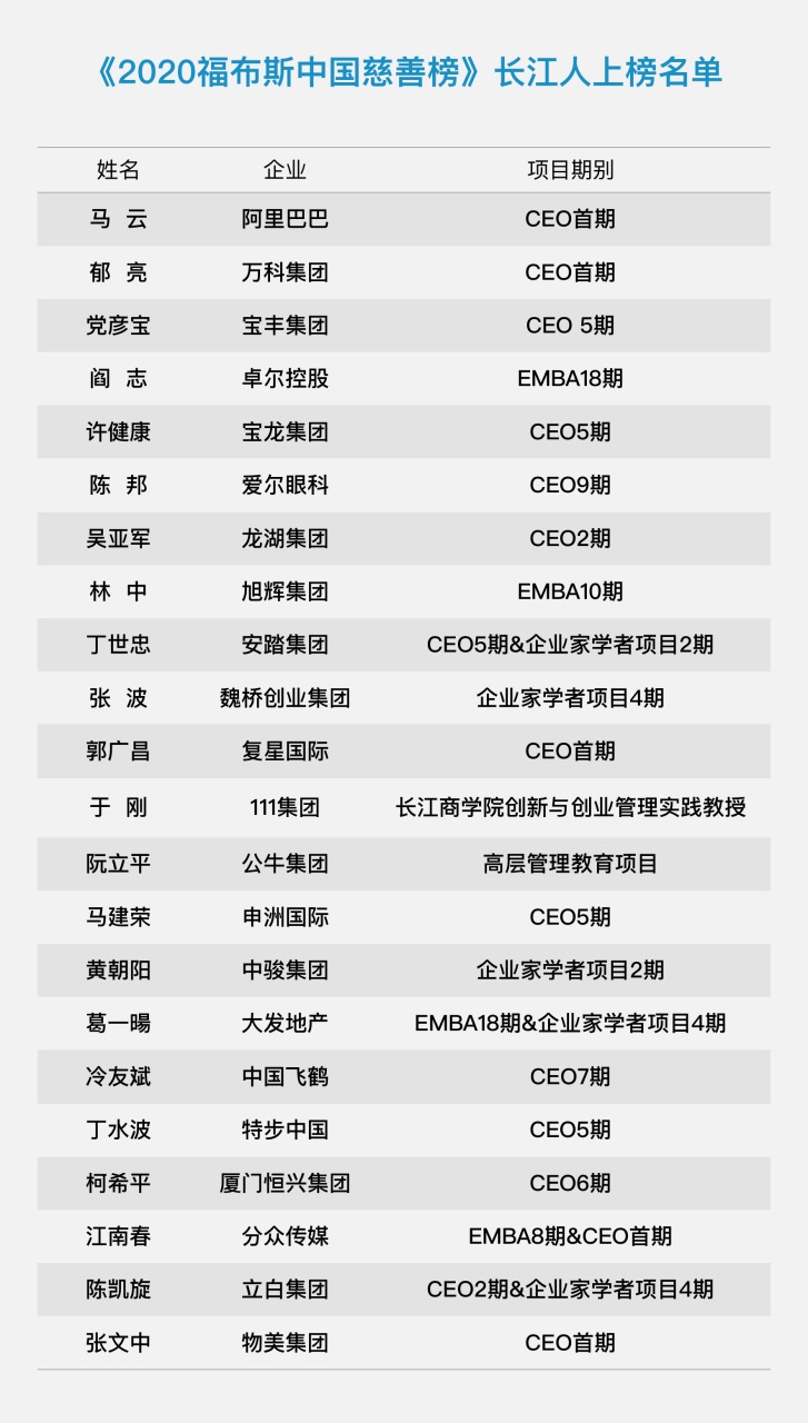 附:《2020福布斯中国慈善榜》长江人上榜名单
