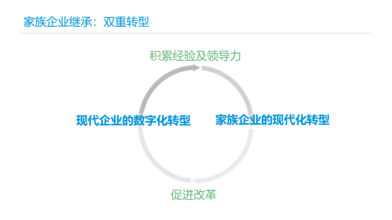 范昕宇博士更加详细地阐释了家族企业的转型:“中国的家族企业实际上在经历‘双重转型’:一个是家族企业的现代化转型,一个是现代企业的数字化转型。这两个转型同时存在,相互作用。年轻一代企业家在数字化转型中积累了经验和领导力,可以帮助个人在内部顺利继承家族企业。传承工作的顺利完成,又能够更好地帮助企业进行顺应时代的数字化转型。这两个作用互相促进、形成正反馈。”