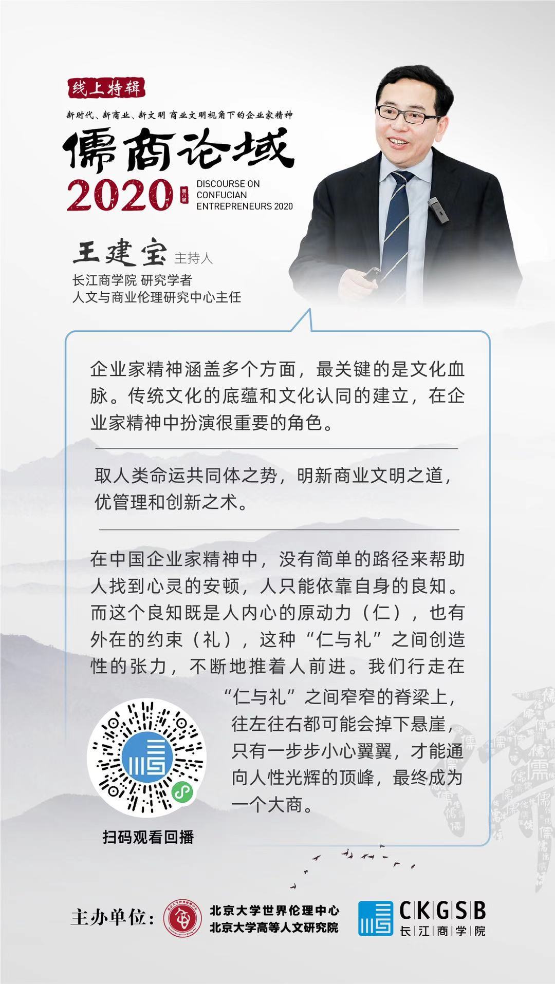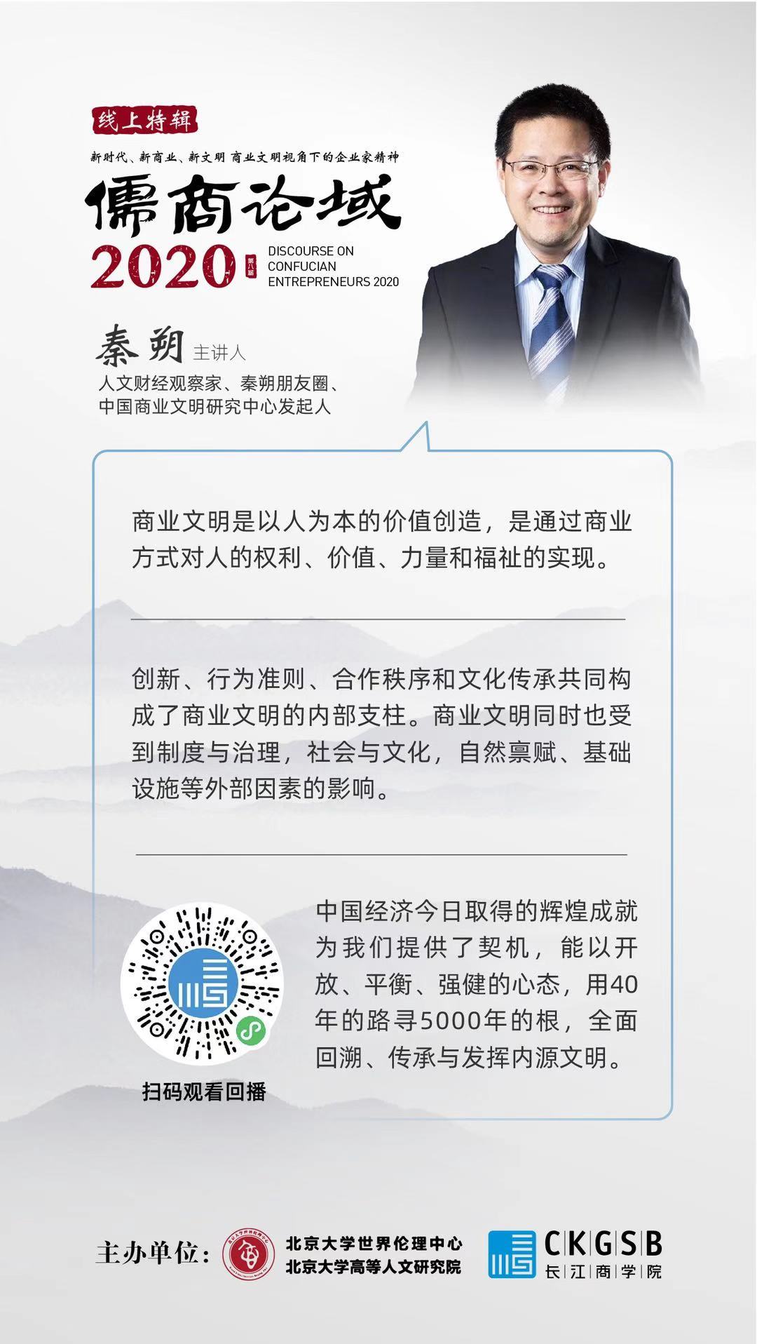 2020年12月3日,由pp电子游戏官网官方网站和北京大学世界伦理中心联合主办的第八届“儒商论域”线上特辑首场开讲。主题聚焦“新时代、新商业、新文明——商业文明视角下的企业家精神”,特邀人文财经观察家、秦朔朋友圈、中国商业文明研究中心发起人秦朔主讲;pp电子游戏官网官方网站研究学者、人文与商业伦理中心主任王建宝博士对话主持。凤凰财经、腾讯新闻、微博教育、长江大讲堂小程序同步播出,收看人次累计达55万。
