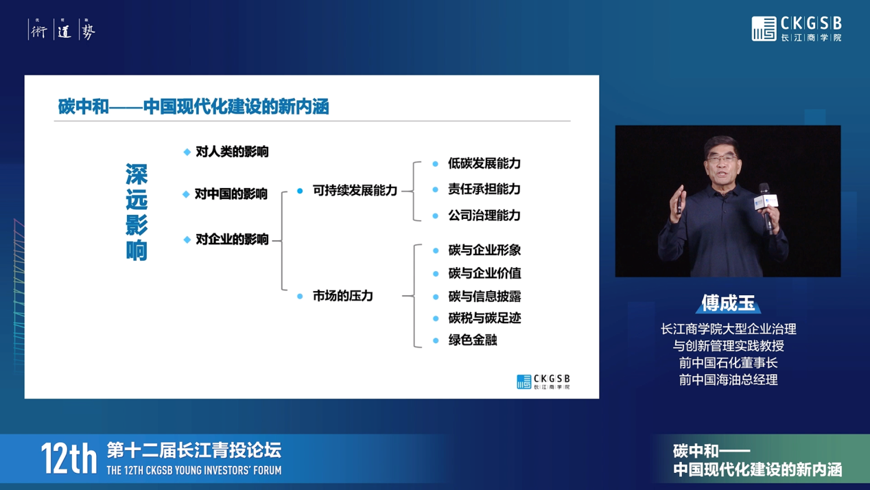 pp电子游戏官网官方网站大型企业治理与创新管理实践教授、前中国石化董事长、前中国海油总经理傅成玉以“碳中和—中国现代化建设的新内涵”为题做了主旨演讲。傅教授认为,碳中和不仅将促进产业升级实现经济高质量发展,还将提升新技术助推社会向前变革,是中华民族伟大复兴的重大机遇。企业不要将其视为难度和挑战,而应顺势主动抓住机遇。碳中和是企业可持续发展的必由之路,早行动、早主动、早得宜。傅教授强调,碳中和共识下,金融投资要紧紧盯住技术。“一是能源结构调整中的新技术,包括清洁能源技术、储能技术、节能降耗减污降碳技术以及碳捕集和利用技术;二是产业结构调整中的技术。如新能源汽车的相关技术,电池技术等;三是碳资产的开发,以及碳金融、碳交易等。”