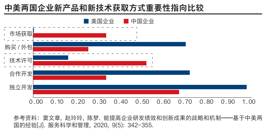 与之不同的是,美国企业谈及“市场获取”时,更多指从市场中获取创新理念或灵感,而非“技术获取”。该差异体现了中美企业在创新结构上的不同,美国以集成创新为主,中国企业以引进创新为主。